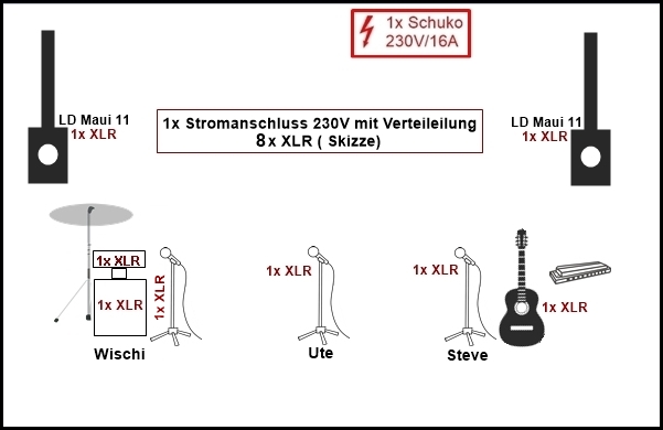 Bei der von Veranstalterseite gestellten PA benötigen wir sechs Mikrofoneingänge (Xlr) mit Phantomspeisung (einmal Gitarre, zweimal Gesang, dreimal Schlagzeug oder Cajon).